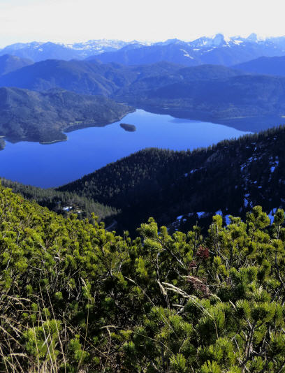 In fünfzehn Minuten war ich oben. So vertraut mir der Gipfel inzwischen war, diesmal bot er mir ein völlig anderes Bild: Waren die Berge und Bergketten sonst weit weg und zeigten sich in abgestuften Grautönen, konnte ich sie heute greifen. Messerscharf traten ihre Konturen hervor und waren räumlich wahrnehmbar. Kochel- und Walchensee glichen Spiegel, royalblau der eine, tiefblau der andere, zudem fehlten die Farbtupfer auf ihnen, im Sommer gemalt von Surfern und Kytern.