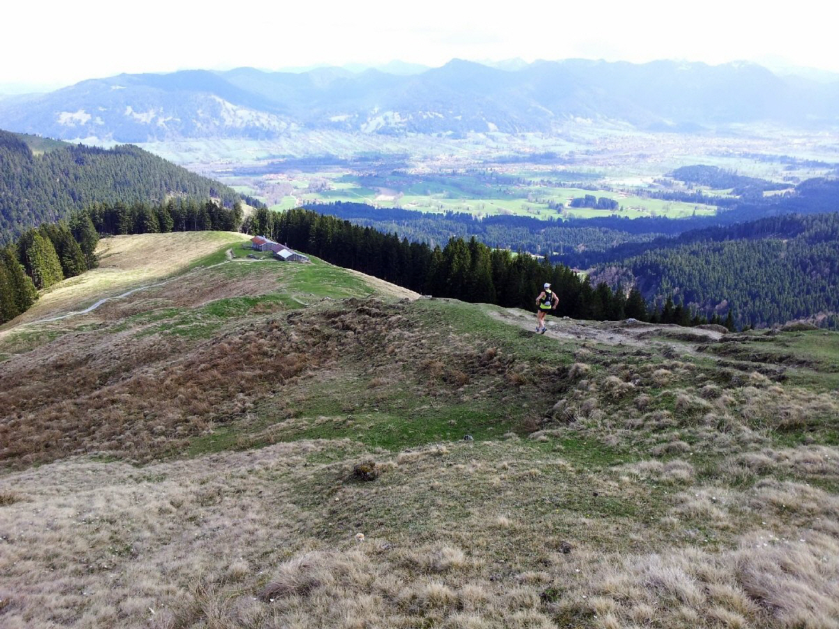 Wir laufen über die bekannten Stationen zurück, nochmal hoch zum Zwiesel und dann hinüber zum Stallauer Kopf (1322m), und endlich haben wir wieder einen Trail unter den Füßen. Die ersten 100 Höhenmeter hinunter zum Stallauer Eck sind gut zu laufen und technisch nicht schwer. Das aber ändert sich auf den letzten drei Kilometern, wo es 500 Höhenmeter steil über Wurzeltrails hinunter geht. Der Abstand zwischen mir und Christian wird immer größer. Er fegt geradezu im Flow über die riesigen Wurzeln, dass ich mit Hinterhersehen kaum noch nachkomme. Unten angekommen meint er dann, das war ganz schön knifflig. Ja, das war es, an manchen Stellen war ich langsamer unterwegs war als die Kontinentalverschiebung.