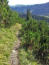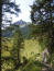Dieser rockige zu rockende Weg begleitet uns noch ein ganzes Stück nach oben, bis er flacher wird und wir von der Nordseite auf die Südseite wechseln. Die Landschaft wird romantisch. Munter schlängelt sich der Pfad in kleinen Aufs und Abs durch einzel stehende Fichten und vorbei an Felsbrocken. Schön ist es hier zu Laufen unter blauem Himmel bei angenehmen Temperaturen, und hinter jeder Kurve überraschen uns neue Ausschnitte aus der Kreuther Bergwelt, die uns Vorfreude auf das machen, was noch vor uns liegt.