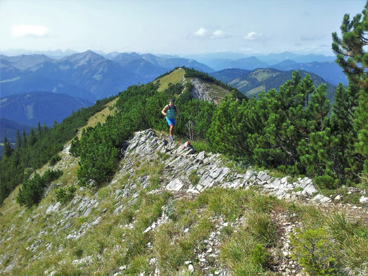 Wir laufen die engen Serpentinen nach der Wichtelplatte hinunter und nehmen den Schwung mit hoch zur Blaubergschneid (1785m). Natürlich könnten wir hier ohne zu stoppen gleich weiterlaufen, wir könnten beim Trailrunning auch immer nur laufen und laufen, auf den Boden gucken und laufen. Tun wir aber nicht. Wir bleiben stehen und genießen. Genießen den Blick auf den weiteren Verlauf, den Blick hinüber zum Guffert, den Blick zurück und den tiefen Blick über die Kante in Richtung Tegernsee. Genuß statt Gehetze. Der Kamm übrigens entspricht dem Grenzverlauf zwischen Tirol und Bayern. Unterwegs aber sind wir in Tirol. Wieder geht es hinunter und dann wieder hoch, diesmal zur Karspitz (1800m). Das Gelände wird ruppiger und zwingt hin und wieder zum Gehen. Wir passieren nordseitig eine leicht ausgesetzte Stelle und laufen gleich wieder auf der Südseite unterhalb der Karspitz weiter. Dort erreichen wir den Abzweiger, der uns später zur Guffert-Hütte bringen wird, erstmal aber geht's hoch zum höchsten Gipfel der Tegernseer Bergwelt.
