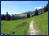 Auf einer Schotterpiste also laufen wir los und werden gleich wieder ausgebremst von einer gut 15-köpfigen Wandergruppe, die einen Tick eher fertig war als wir. Natürlich schnattern sie alle wild drauf los, sind ja gerade erst 500m unterwegs. Irgendwie mogelt man sich dann doch vorbei und ist hinterher froh, nicht aufgespießt worden zu sein. Bald geht es rechter Hand direkt rauf zur Hochries, über die Seitenalmen-Route, auf der wir zum Schluß herunterwedeln werden, oder rodeln. Wir laufen geradeaus weiter und tauchen leider nach einem Kilometer aus dem Wald heraus und mittenhinein in die aufgeheizte Luft. Erstmal noch geht es flach auf einem Forstweg dahin, links und rechts üppiges Grün und Maiblümchen. Darüber der Riesenberg, der mehr lang als hoch ist. Jedenfalls wollen wir um den herum. Bald schweben ein paar leere Sessel über uns, die bei Mittelstation der Hochriesbahn umdrehen. Ganz nach oben geht es dann mit Gondeln.
