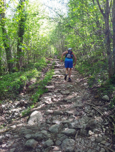 Auch wir schweben, auf Wolke 7, denn endlich sind wir wieder in den Bergen, laufen weiter, mal im Schatten, mal in praller Sonne, durch Wald und über Wiesen, inzwischen deutlich bergauf. Und weil es auf Forstwegen so schön ist und es sich gut quatschen lässt, verpassen wir doch glatt den Trail, der uns hinüber bringt zum Gästehaus Winterstube. Die ersten 7km liegen hinter uns, und vor uns ein Sahnestückchen: ein Wanderweg durch allerschönsten Mischwald an steilen Hängen, hochgewachsene Buchen und Fichten und dazwischen Bergahörner. Wir erreichen die Frasdorfer Hütte oberhalb von Aschau und kurz darauf die Hofalm, schauen hinüber zur Kampenwand, die von hier aus gesehen schmal und spitz über den anderen Gipfeln herausragt und drehen dann nach 9km auf südlichen Kurs. Ein kurzes Stück geht es bergab, bevor der lange Aufstieg zum Klausenberg beginnt.