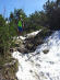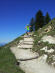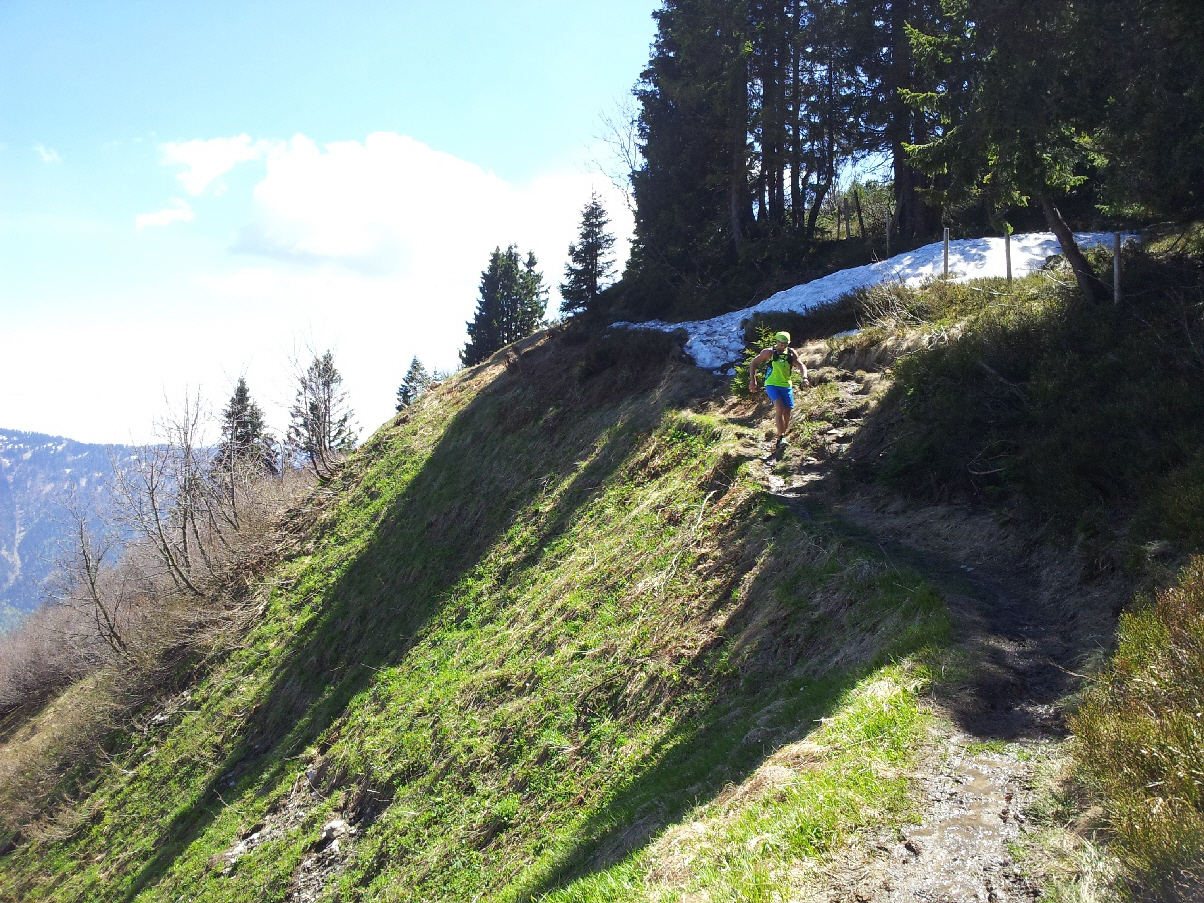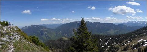 Dann, endlich, geht es wieder mal bergab mit uns. Und mitten hinein in den Schnee, der hier augebreitet wie riesige Teppiche fleckerlmäßig herumliegt und uns nasse Füße macht. Die Landschaft aber ist beindruckend, auch der Blick hinunter in dem vom Eis eindruckvoll gestalteter Kessel mit der Abergalm. Das Grün hier auffallend intenisv. 18km liegen hinter uns, und vor uns der zweite Anstieg hinauf zur Hochries. Der Pfad ist steil und übersäht mit großen Steinen. Auf 2 Kilometer überwinden wir 300 Höhenmeter. Dann endlich stehen wir an der Bergstation der Hochries (1542m). Der als "Aussichtsberg der Extraklasse, sozusagen ein Logenplatz", ausgelobte Berg ist an dieser Stelle für mich weder romantisch noch spannend. Der Blick auf den Kaiser und Watzmann war unterwegs schöner. Fein allerdings der Blick auf den Chiemsee und seinen kleinen Bruder, der Simsee. Erinnerungen an Übersee am Chiemsee steigen hoch, wo ich viele Jahre mit Segeln und Surfen verbracht habe. Auch an den Simsee, wo ich es vor mehr als 20 Jahren beim Simsee-Halbmarathon als brutal anstrengend empfand, kurz vor dem Ziel steil bergauf laufen zu müssen.