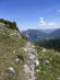 In einer großen Schleife über österreichisches Gebiet erreichen wir den Sattel zwischen Zinn- und Klausenberg mit teilweise steilen Hängen. Hier steht die Klausen-Hütte, eine ehemals beliebte Einkehr, heute wohl dem Verfall preisgegeben. Wir genießen das Panorama, legen die Rucksäcke ab und machen Rast. Christian verrät mir, dass er Wortspiele mag. "An Alm Schuld" (Quelle: Newsticker postillon.com.) Hat bei mir ein bisschen gedauert. Gerne möchte ich mich bei ihm mit diesem Wortspiel bedanken: "Wo kann man 25 Kilo Meter kaufen?" Wir schauen hinüber zu unserem letzten Etappenziel, die Hochries. Dazwischen ein Hochtal. Erstmal aber geht es über einen latschenbewachsenen Kamm hinauf zum Klausenberg (1554m) mit seinem eisernen Kreuz. In einer leichten und aussichtsreichen Kammüberschreitung geht es über einen Kilometer weiter zum kreuzlosen Predigtstuhl. Ein beliebtes Ziel für Skitourengeher von Aschau aus.