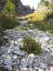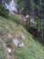 Auch wir machen uns weiter auf den Weg nach unten, laufen einen Pfad, der die Forststraße abkürzt und landen sogleich bei den nächsten beiden Almen (1400m). Der Moaralm und der Enzianhütte. Zwei urige Almen, allerdings mit stark eingeschränktem Platzangebot auf den kleinen Terrassen. Unser Weiterweg führt unterhalb der Moaralm zwischen zwei Almhütten durch, danach ist der Weiterweg nur zu erahnen. Es geht über eine Wiese und von dort hinunter zum Mischwald. Der Schatten hat uns wieder. Auch hier ist die Orientierung nicht ganz leicht, da es viele Wanderwege und -pfade gibt, die sich verzweigen. Wir erreichen einen Pfad, an dessen Anfang Steinmännchen stehen. Bald wird er steil und führt in ein schmales Kar. Nochmal wird es steiler, an ein Laufen ist nicht mehr zu denken. Mehrmals geht es über kurze Wiesenstückchen, und zweimal rutsche ich seitlich über Gras. Mein Schuh, so treu er bisher war, kann das nicht. Ich werde unsicher und hoffe, dieses steile Gelände bald hinter mir lassen zu können. Es wird nochmals steiler. Christian ist hier fast wie eine Gemse unterwegs, mit dem Feline, ich dagegen langsamer als die Kontinentalplattenverschiebung. Aus die Maus. Ich stehe mit dem Rücken zur Wand. Das sieht auch ein nicht mehr ganz junges Paar, das diesen Steig heraufkommt (Wer hat die gerade in diesem Moment hier auftauchen lassen? - eine ernstgemeinte Frage). Wann dieses steile Stück zuende ist, frage ich sie, und unisono kommt zurück, das wird nach unten hin noch schlimmer, deshalb machen wir diese Route im Aufstieg. Und wenn ich hier schon solche Probleme habe ... Ich schaue der Christian an ... Ok, zurück nach oben.