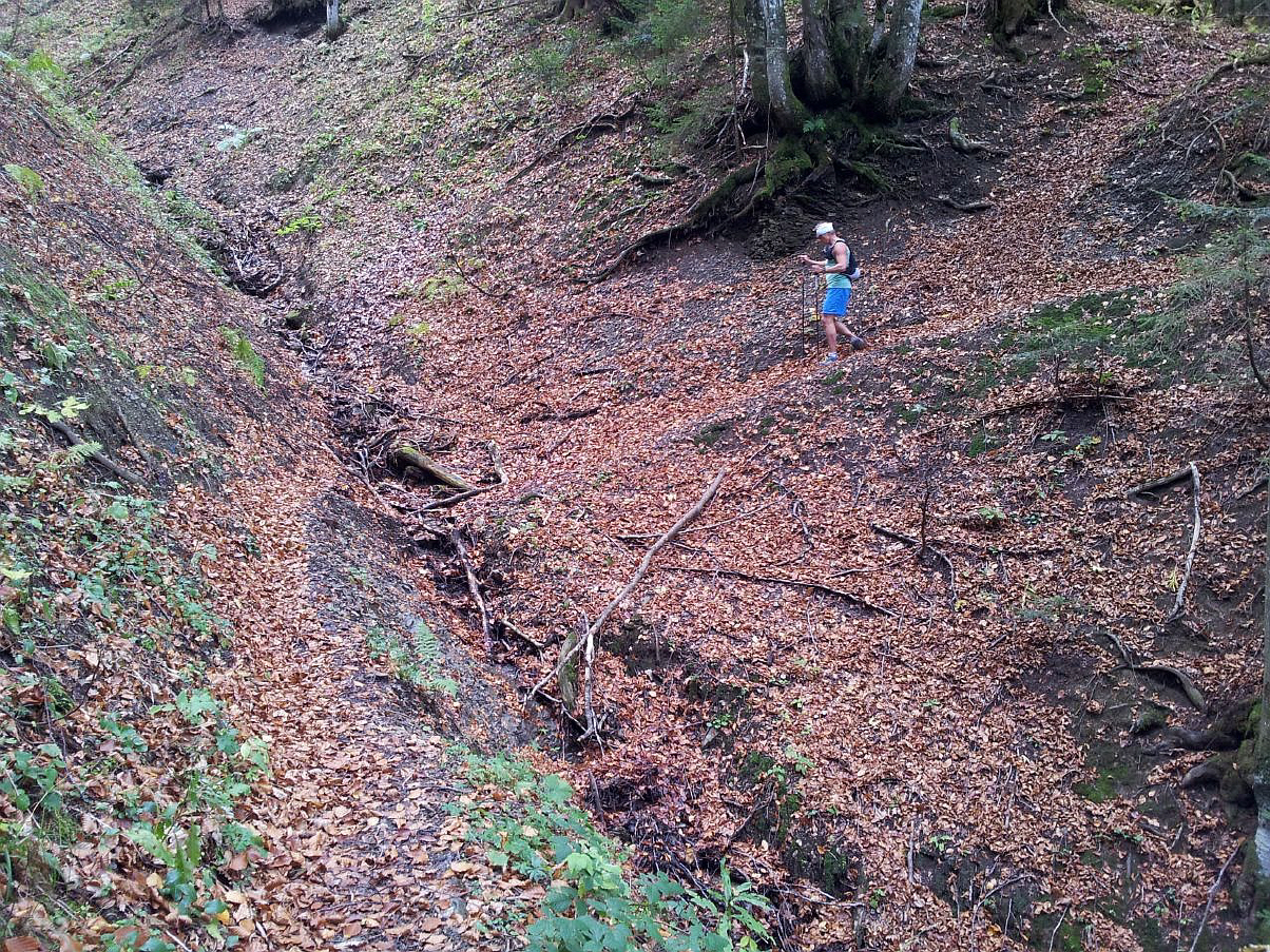 Weiter oben dann laufen wir den Hauptpfad nach links, und der windet sich nicht sehr steil in vielen langen Serpetinen nach unten - da war er wieder, der Flow, der glücklich macht. Ein letztes Stück noch über den Pfad, den wir hochgekommen sind, dann sind wir am Auto. Insgesamt war es eine schönen Runde mit viel Trailanteil und einigen Überraschungen. Dünne Söckchen ...