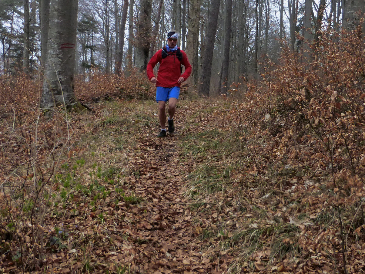 Wir laufen den selben Weg in kleinen Varianten zurück, gondeln dabei erst über einen schnurgerade gezogenen "Seilbahnweg", und später über Trails in steilabfallenden Waldhängen. Dann erreichen wir einen blitzblanken Trail entlang eines Zauns. Ich gebe nochmal Gas ... und ... Aviator. Blöde Wurzel aber auch! Erstaunlicherweise hat meine hauchdünne Windjacke keine Schramme abbekommen, obwohl ich mir eine drei Zentimeter lange blutende Abschürfung am Ellenbogen zugezogen haben.