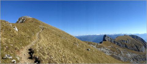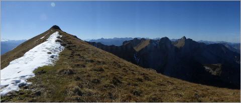 Ich laufe nach rechts weiter und erreiche einen breiten Kamm. Grandios! Ich komme mir vor wie auf einer Startbahn, die mich abheben läßt in Richtung Alpenhauptkamm mit Zwischenlandung auf dem Sagzahn. So leicht geht es dann aber doch nicht, auf dem Klettersteig hoch zum Gipfelkreuz muss Hand angelegt werden. Über den Sagzahn soll es dann relativ einfach weiter auf das Vordere Sonnwendjoch gehen. Relativ zu was? Mir gefällt der Zacken auch von weitem. Ein weibliches Dauerlachen klingt aus der Wand heraus. Vor dem Sagzahn geht es rechts hinunter - die Umgehung. Ein Stückchen weiter weiß ich auch, warum der Spitz "Sägezahn" heißt. Erst aus der seitlichen Perspektive sieht man die gesamte Säge mit dem Endzahn ganz links. Ich laufe weiter hinunter, bleibe dann aber stehen und sondiere die Gegend. Der Pfad führt noch ein ganzes Stück hinunter und verliert sich dann. Ich kann keine Wegführung hinauf zum V.S. ausmachen und befürchte, dass ich nochmal sehr weit absteigen muss. Da die Zeit ein wenig drängt, verwerfe ich die Idee, heute auch noch das V.S. mitzunehmen.