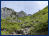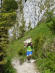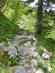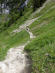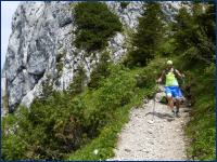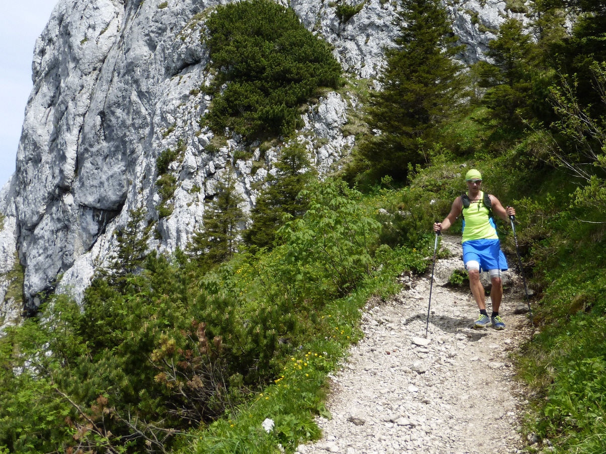 Zunächst ist der Pfad rupig und mit großen Felsbrocken übersäht, zum Laufen für mich zu schwer. Im weiteren Verlauf kommen aber immer wieder laufbare Passagen. In zwanzig Minuten bin ich oben (1620m) und ziehe gleich mal meinen Kopf ein. Zwei Personen, weiblich und männlich, klettern direkt über mir in der speckigen Felsrinne zum Buchstein hoch. Mehr Aussicht als die von der Terrasse aus brauche ich nicht. Wozu die paar Höhenmeter mehr? Auch auf den Roßstein zieht es mich nicht, auf den Weg vorne hinunter schon gar nicht. Ich bleibe eine Viertelstunde, verdrücke mich dann hintenherum und freue mich, mit meinen Stöcken weite Teile des sogenannten Altweibersteigs hinunterlaufen zu können.