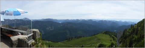 Vor mir die Röhrlmoosalm. Auf einem breiten und flachen Wirtschaftsweg laufe ich in der Sonne in Richtung Lenggries, bis ich eine kleine Holzkapelle erreiche. Bevor ich jedoch dort entlang eines Zaunes weiter hoch laufe, verstricke ich mich in ein Gespräch, das dauern und das weiter oben eine Fortsetzung finden sollte. Wieder geht es in den Wald hinein, der steinige und wurzelige Weg wird steiler und matschiger. Ein kleiner Rinnsal kommt mir entgegen. Aussicht bisher keine. Das ändert sich, als ich auf einem Wirtschaftsweg lande. Rechts die Westseite vom RuB-Stein, links die Tegernseer Berge, das Karwendel und leuchtend weiß der Hohe-Tauern.