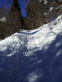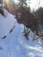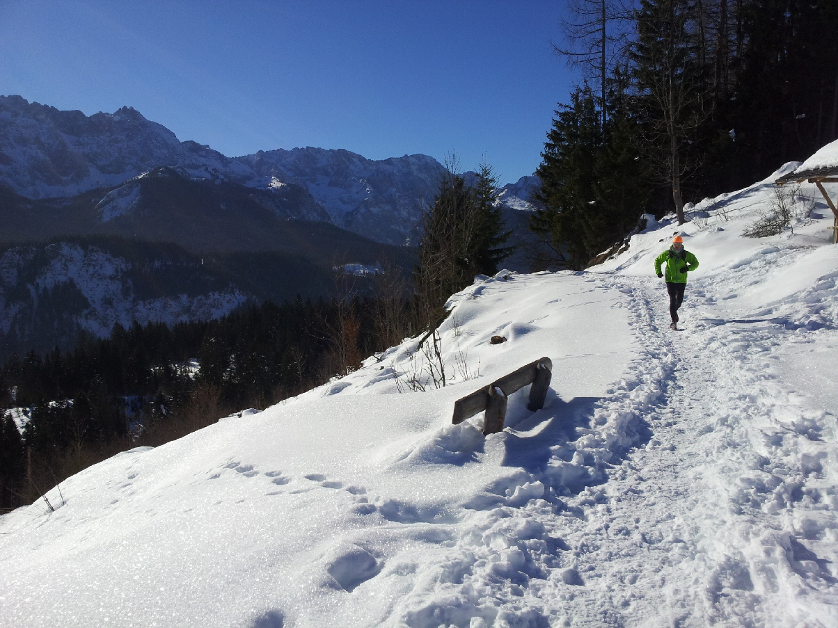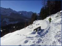 Auch Bewegung wärmt, und so traben wir um 10 Uhr los. Vorbei am Olympia-Skistadion und weiter auf der Wildenauer Straße, die wir nach genau einem Kilometer hinter der ersten Brücke über die Partnach nach rechts verlassen. Ziemlich steil geht es jetzt 300hm rauf zur Partnachalm, und mehr und mehr tauchen wir ein in eine traumhaft schöne Winterlandschaft. Der Schnee auf dem breiten Weg ist griffig und gut zu laufen. Direkt hinter der Alm, nach bisher 3km, biegen wir scharf nach links ab und landen auf einem Downhill Wintersingletrail, der uns in wenigen Serpentinen hinunterbringt zur Eisernen Brücke (866m ) über der Partnachklamm. Wir schauen tief hinunter und bewundern die von der Natur geformten Gebilde aus Eis. Und schon laufen wir wieder der Sonne entgegen, steil hinauf zum Graseck, vorbei einem Wellness-Hotel, das so gar nicht in diese Landschaft passt.