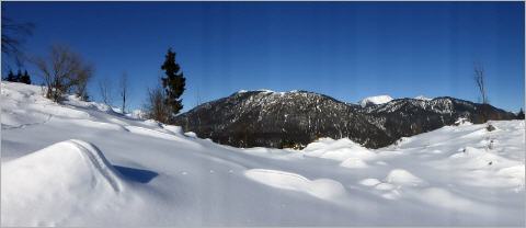 Die Bedenken, dass unsere Lauferei jetzt nach sieben Kilometern ein jähes Ende nehmen wird und wir durch tiefen Schnee stapfen müssen, war unbegründet. Bis zum Abzweiger Wamberg-Elmauer Alm laufen wir auf diesem Höhenrücken munter und flowig auf gleicher Höhe dahin, und nehmen einen kleinen Abstecher von knapp zwei Kilometern in Richtung Elmauer-Alm mit. Hat uns bis jetzt die Kälte nicht losgelassen, so wurde es jetzt endlich ein wenig wärmer. An einem Aussichtspunkt mit überdachten Bänken halten wir an und schauen hinüber in Richtung Wank, an dessen Südseite ein weiterer bekannter Berggasthof liegt, der Gschwandtnerbauer. Dort hinüber wollen wir, so jedenfalls sieht es Christians fein ausgearbeiteter Plan für heute vor.