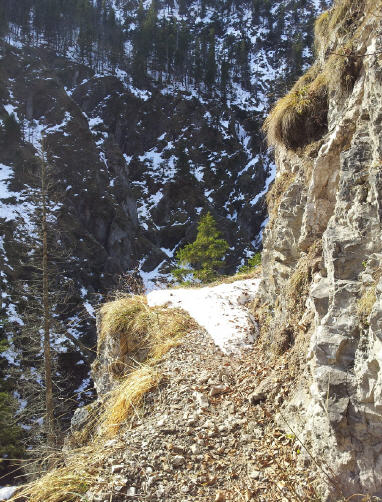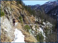 Wir starten am Schützenhaus-Parkplatz unterhalb der Kirche (zahlungspflichtig, 2,00€/Tag, auch der andere Wanderparkplatz). Es geht über ein Brückerl über die Kleine Laine, und schon sind wir auf einem Trail unterwegs. Mal auf mal ohne Schnee. Entlang der tief eingeschnittenen Laine erreichen wir eine vereiste Forststraße und orientieren uns Richtung Benediktenwand. Nach ca. 3,5km geht links bei einem Marterl und einer Brücke ein ausgeschildeter Abwzeiger weg. Rabenkopf/Rappinschlucht. Ein dicker Schneeteppich liegt vor uns, ungespurt. Vielleicht, weil in Wanderführern davon abgeraten wird, diesen schmalen exponierten Pfad bei Feuchtigkeit, Schnee und Eis zu begehen. Da ich mich eher zu den Angsthasen zähle, habe ich es mir vorbehalte, umzudrehen. Da aber der Schnee an den heiklen Stellen relativ hoch lag und es keine eisigen Stellen gab, waren diese gut zu meistern. Das war gut so, denn die winterliche Landschaft und der tiefe Blick hinunter in die Klamm der Rappinlaine sind ein großartiges Schauspiel. Wir mittendrinn. Und unsere Füße mittendrinn im Schnee, jedenfalls anfangs im unteren Teil des Anstiegs. Weiter oben schon scheint die Sonne auf den schmalen Pfad und der Schnee wird weniger. Viel zu früh führt der ansteigende Pfad in den Wald hinein, und das Laufen mit Tiefblick findet ein Ende. Wieder geht es auf und im Schnee dahin, manchmal wadeltief. Heute spurt Christian.