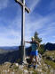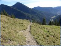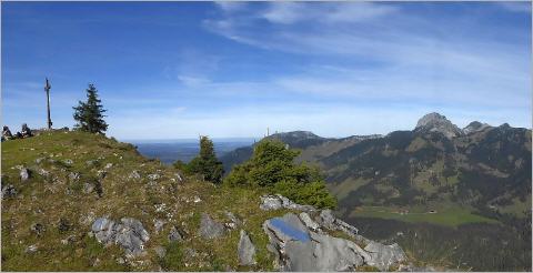 Ich erreiche die Seeberg Alm (ca. 1350m), die ebenfalls geschlossen ist. Ein älterer Herr, der es sich hier gemütlich gemacht hat, verrät mir seinen Lieblingsberg in dieser Ecke, die Aiplspitze, die von hier gut zu sehen ist. Für mich geht es weiter. Auch die letzten knapp 200hm zum Gipfel sind laufbar, wenngleich das Gelände felsiger wird. Ich erreiche die Kante und natürlich springt mich wieder der Wendelstein und links davon der Breitenstein an. Gerne erinnere ich die Breitenstein-Wendelstein-Runde, zumal sie ein Test dafür war, ob meine damals angeknackste Rippe halten würde. Die letzten Schritte zum Kreuz gehe ich und treffe auf zwei "Alte Weiber" (sie selbst nannten sich so, weil ja Altweiber-Sommer ist.) Wahrscheinlich lag es aber am Ouzo, den sie süffelten und auch mir anboten. Ich sagte nur: "Oh oh!" und sie meinten, was heißt da "Oh oh?". Ich gehe weiter, ziehe mein klatschnasses Shirt aus und eine zweite trockene Lage an, schnappe mir mein Fläschchen mit Zaubertrunk und genieße die Sonne und die Aussicht. Auch schaue ich hinunter nach Osterhofen auf den Parkplatz und verfolge die Linie meines bisherigen Laufs über die Hochkreuth, die noch in der Sonne liegt. Gute 10km waren es bis zum Gipfel, und davon fast alles laufbar.