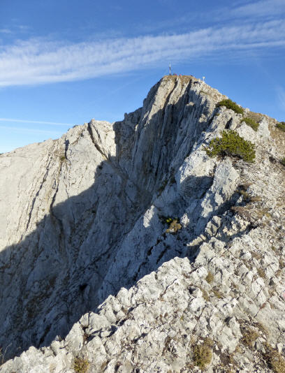 Ich schwitze. Kann mich nicht erinnern, schon mal so steil aufgestiegen zu sein. Kletternderweise durchsteige ich mehrere flache Kamine und kraxel über kleinere Stufen. Wenngleich der Steig nahe der Kante entlang verläuft, ausgesetzt war er bis jetzt nicht. Bald steige ich von der nördlichen auf die südliche Seite. Hier nur noch Felsen. Das Kreuz schon zu sehen. Die Markierungen ausgezeichnet, wie schon den ganzen Weg herauf. Vorbei an einer kurzen exponierten Stelle erreiche ich wenig später den Gipfel - und mit ihm mein Gipfelglück. Wie immer gehe ich sofort ans Kreuz und sehe mich erstmal um. Den Fehler wie am Breitenstein mache ich nicht nochmal, Ankommen ohne zu Gucken. Als Ruhe in meinem Bauch eingekehrt und der Atem ruhig geworden ist, hole ich mir meine Belohnung ab für die Mühe bis jetzt: der Blick hinunter zum Achensee und hinüber ins Rofan. Ich bin dankbar, jetzt, Mitte November in der Sonne bei nahezu Windstille hier oben stehen zu dürfen. Zusammen mit drei anderen und bald darauf einem Münchner, hierhergekommen über den Verbindungsgrat von der Seekarspitze.