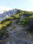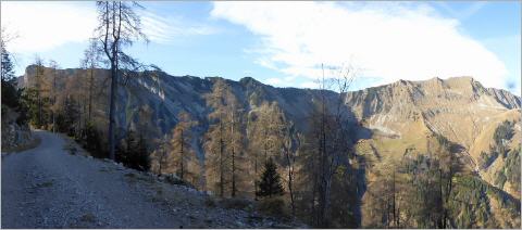 Für mich geht es unten herum weiter auf einer Forststraße zur Passilalm (1557m). Hell leuchten der Hohe Kasten und die Hohe Gans, markante Gipfel eines Bergmassivs westlich von mir, das mich eine Weile wie auf eine riesige Leinwand projeziert begleitet. Im leichten Auf und Ab lande ich nach insgesamt 6,5km an der Passilalm, eine Ansammlung von dem Verfall preisgegebenen und neugebauten Almgebäuden. Darüber zum ersten Mal detailreich zu sehen die rauhe Nordseite der Seebergspitze. Die Spannung steigt. Rauf zum Pasillsattel (1680m) wird es steiler und felsiger.
