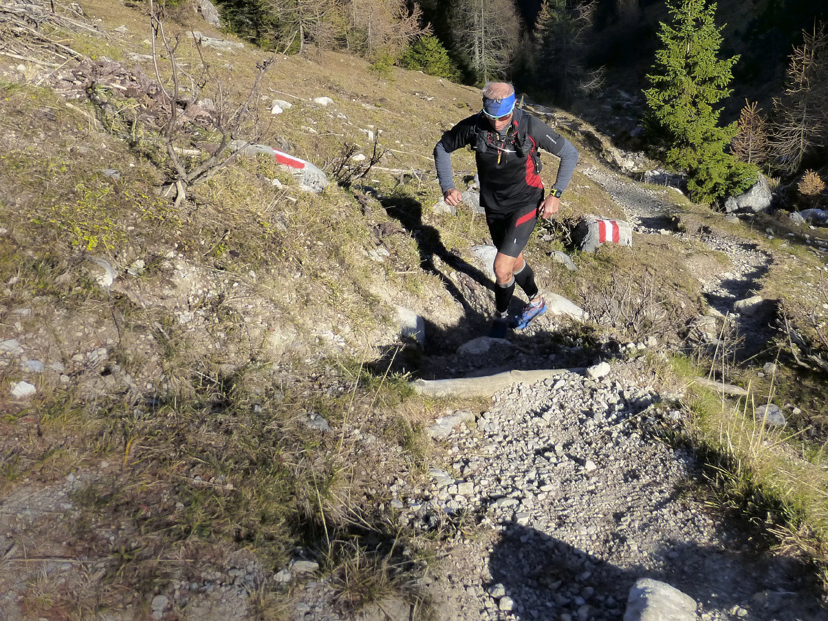 Frisch aufgetankt laufe ich über die Forststraße zur Seekaralm (Brunnen lief) und dann endlich den rassigen Trail im Bergwald hinunter, in Serpentinen über Wurzeln und Steine, trocken, wie auch das Laub. Einfach fetzig! Ein grandioser Abschluss dieses schönen Tages. Ein schöner Abschluss einer Saison, die mich wieder ein ganzes Stück hat wachsen lassen, jetzt, wo ich wieder solo unterwegs bin. Gewachsen bin ich auch dank Christian, von dem ich in den drei Jahren, wo wir viel gemeinsam unterwegs waren, viel lernen konnte.