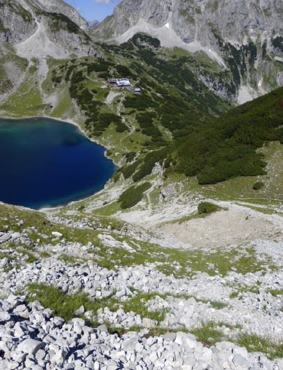 Alleine ist man hier nicht. Das aber ändert sich hinauf zur Coburger Hütte. Der Weg wird zum Pfad, der Pfad wird steiler, die Passagen sind felsendurchsetzt. Der Blick hinunter zum Seebensee mit der Zugspitze im Hintergrund zwingt zum Stehenbleiben. Nicht lange, und die Coburger Hütte (1917m) taucht auf. Und die nächste Perle. Über Latschen hinweg schaue ich von der noch wenig besuchten Terrasse hinunter zum tiefblauen Drachensee und die ihn zierenden Felsgipfel. Ich komme aus dem Staunen nicht mehr heraus.