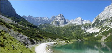 Wenig später, nach gut 5km, öffnet sich der Blick auf den kristallklaren Seebensee (1657m). Türkis leuchtet er vor der Sonnenspitze. Ich tauche meine Kappe ein, setze sie patschnass auf, wandere gemütlich weiter zu seinem anderen Ende und drehe mich um. Majestätisch erhebt sich die Zugspitze im Hintergrund über dem Seebensee, der topasgleich verschiedene Farben annehmen kann, jetzt liegt er Himmelblau vor mir.