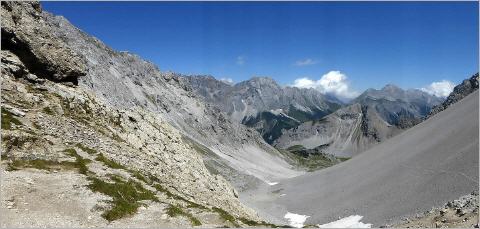 Spärlich das Grün, dominierend das Grau. Rechts ein Pfad über Geröll, meiner geht direkt hinunter. Anfangs steil windet sich der Ganghofersteig in zahlreichen Kehren im Brendelkar hinunter. Dreimal stapfe ich durch leicht aufgetaute Schneefelder. Das Kar wird flacher und ist wieder gut laufbar. Das Geröll und der Schnee liegen hinter mir, die Landschaft wird wieder Grün. Der Pfad führt vorbei an einer Felswand. Ein kleiner Stein fällt mir beinahe auf den Kopf. Der von Alpenrosen gesäumter Pfad lässt mich den Stein schnell vergessen, auch der Blick hinüber zum Wetterstein. Nach gut 13km treffe ich wieder auf den Wanderweg, auf dem ich hoch gekommen bin. Vorbei geht es an der Ehrwalder Alm und ich sehe, dass es zwei Wege zur Talstation gibt. Eine Straße für Autos und Fahrräder, und einen Wiesenweg. Schade, hätte ich gerne am Anfang gewusst. Wurscht! Vollgetankt mit guter Laune und Glücksgefühlen laufe ich die letzten drei Kilometer ins Tal.