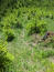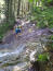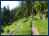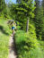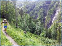 Nachdem ich mein Fläschchen mit Hafermehlsuppe zu etwa Dreiviertel geleert habe - Christian vergaß darauf, was ihn später noch wurmte - beginnt unser Downhill auf der Südseite hinunter zu Ritzelsberg-Alm. Und da begann das Herumgewurschtel auf dem Trail, denn ein Laufen ist hier nahezu unmöglich. Den ganzen langen Weg hinunter stellen sich Latschen frech und widerspenstig in den Weg und lassen uns hart arbeiten, nicht selten derart, dass wir uns tief bücken müssen. Gut, gehört zum Trailrunning, wie das Durchschreiten von Bächen oder sumpfigen Untergründen auch. Ne Schinderei war es dennoch, zumal die aufgestaute Hitze in den Latschengassen kräftezehrend war. Der Trail selbst war abschüssig und oft zugewachsen.