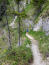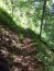 Nahe der Alm erreichen wir den Baum, an dem die Wegweiser derart deppert angebracht sind, dass der Pfad hinunter zum Trausnitzmarterl kaum auszumachen ist. Was mich vor einem halben Jahr bewog, einfach dem trockenen Bachbett zu folgen, das hier begann. Und heute? Christians GPS wies uns anfangs den Weg, ein Pfad der links am Hang hinauf führte, dann aber immer wieder überwachsen ins Leere lief. Zweimal mussten wir zehn bis zwanzig Höhenmeter hinaufsteigen, um wieder in der Spur zu sein. An ein Laufen im Flow war auch hier nicht zu denken.