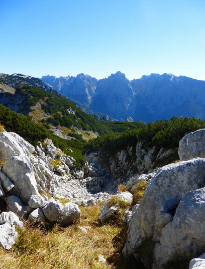 Ich liebe diesen Blick hinunter in ein Kar, in die kesselförmigen Eintiefungen an Berghängen unterhalb von Gipfel- und Kammlagen, besonders wenn sie breit und sonnendurchflutet sind, wie heute das Öchselweidkar. 600hm geht es auf 2km hinunter. Das, was zählt, ist der Trail, und das, was es zu sehen gibt: Der Wilde Kaiser rückt immer näher, Gemsen und noch mehr Gemsen nehmen Reißaus. Weit unten rechts das Inntal. Und ich ganz alleine in dieser kargen Landschaft, mal laufend - wer hätte das gedacht! - mal wandernd, mit riesigem Glücksgefühl im Herzen. Zuletzt quere ich ein Geröllfeld und stehe alsbald vor einer Weggabelung. Links geht es zur Stripsenjoch-, rechts zur Vorderkaiserfeldenhütte. Für mich also rechts und nochmal ein kurzes Stück über Geröll, bevor mich der schattenspendende Wald aufnimmt und mir einen laufbaren Trail unter die Füße legt. Laufbar ja, aber holprig.