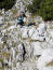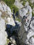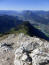 Laufen wird also zur schönsten Nebensache heute, jedenfalls bis zur Pyramidenspitze, und so balanciere ich über Felsblöcke, springe über Wurzeln und Steine, bleibe stehen und gucke in die Chiemgauer Alpen, passiere Einserkogel (1924 m) und Zwölferkogel (1912 m), klettere einen mit Drahtseil gesicherten Kamin, das Vogelbad (1876m), hinunter, kann sogar den Tiefblick über die senkrecht verlaufende Spalte hinaus genießen und freue mich, unten angekommen, nach rechts einen sicheren Weiterweg unter den Füßen zu haben, der mich kurz über Schnee hinweg nach insgesamt 10km hinauf bringt auf die Pyramidenspitze (1997m).