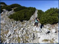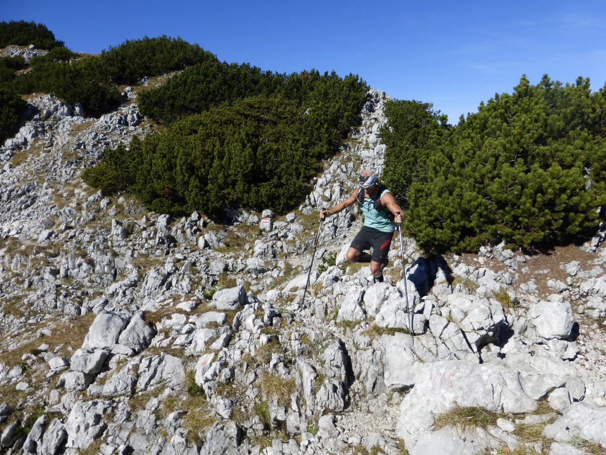 Dann schaue ich auf meinen Weiterweg: grüner geht es kaum. Latschen, dicht an dicht. Da sollte sich doch ein flowig zu laufender Trail hindurch schlängeln. Wunschkonzert! Die Realität sieht leider anders aus. Holprig und verblockt ist das, was sich auf dem gesamten Plateauweg bis zur Pyramidenspitze durch Mulden und über Buckel dahinschlängelt. Selbst schnelles Wandern fällt schwer. Ich hinterfrage mein Tun. Irgendwann kommt mir Bruchrechnen in den Sinn. Zähler und Nenner. TRAIL:RUNNING. Natürlich wünscht man sich als Trailrunner flowige Pfade, wo zwei, drei Kilometer rasch verputzt sind. Dass sich solche Pfade eher im Bergwald finden, ist auch klar. Dass aber hier oben auf dem breiten Kamm des Zahmen Kaiser solch laufbare Pfade eine Rarität sind, damit hatte ich nicht gerechnet.
