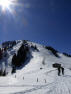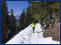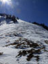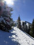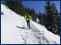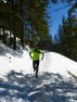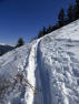 Also laufe ich gleich um das Wallberghaus am Sattel zwischen Wallberg und Setzberg herum und beginne mit dem Aufstieg. Links entdecke ich grüne apere Stellen, auf die ich sofort zusteuere. Hübsch steil, aber es geht voran. Weiter oben nur ein paar Tourenskigeher. Aber keine grünen Stellen mehr. Ich lande in allerfeinstem Pulver, und das bei intensiver Sonneneinstrahlung. Das Aufwärtswühlen beginnt. Derart anstrengend hatte ich es mir allerdings nicht vorgestellt. Bei jedem Schritt rutsche ich weg, selbst auf den Spuren der Tourengeher. Ging das im Rofan Mitte Januar noch ganz gut, bin ich heute eher am Verzweifeln. Und das steilere Stück liegt noch vor mir. Ich überlege. Da ich auf diesem tiefen Pulver nicht runtersausen kann, macht es keinen Sinn, mich weiter hinaufzuwühlen. Ich drehe um.