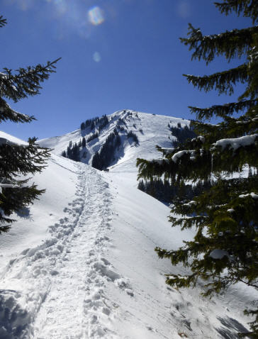 Parken an der Wallbergbahn kostet nichts. Gleich hinter der Talstation beginnt der Wanderweg. Von Beginn an laufe ich über niedergetrampelten Schnee und gewinne rasch an Höhe. Dann eine Kreuzung. Links der Sommerweg, rechts der Winterweg. Gleichzeitig die Streckenführung des legendären Wallberglauf, den es leider nicht mehr gibt. Ich laufe rechts weiter. Der gespurte Pfad zieht deutlich an, der Schnee ist griffig.