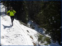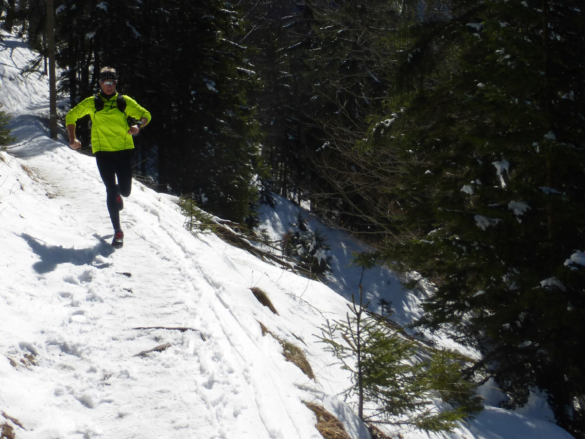 Das mit der Winterpfadrennerei und dem Batz: Wenn man nicht in den Bergen wohnt, ist es schwer, einzuschätzen, wie die Verhältnisse sind. Pisten werden präpariert, Pfade nicht. Der Wunsch, einigermaßen laufbare Untergründe unter die Trailschuhe zu bekommen, wird leider nicht immer erfüllt. Und so ist der Kopf auf der Fahrt in die Berge damit beschäftigt, wie es wohl heute sein wird. Beim Wallberg bin ich optimistisch, da die Pfade nordseitig durch den Wald hinaufführen. Zudem ist der Berg meist gut besucht.