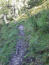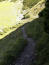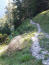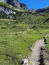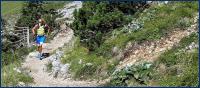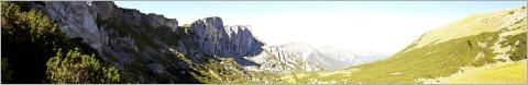 Die ersten 4km vergehen wie im Flug und bringen mich zum Steinernen Tor (1955m), einem Einschnitt im Verbindungskamm zwischen Klobenjoch und Streichkopf. Mein höchster Punkt heute. Klasse der tiefe Blick hinunter und entlang den steil abfallenden Felswänden, die mich eine Weile begleiten werden. Das Licht an diesem Vormittag ein Traum. Den vor mir liegenden Downhill bin ich schon mal Christian gelaufen, auf meiner bisher anstrengensten Tour: Hochiss und Unnützübeschreitung Mitte August 2017. Anfangs steil geht es hinunter in das Hochtal mit Almen und Latschen. Unten angekommen warten tiefe Kuhtrails mit batzigen Löchern auf mich, und prompt taucht mein rechtes Bein tief in die braune Pampe ein. Bald schlängelt sich der muntere und inzwischen trockene Trail durch Latschen und Felsbrocken in Richtung Kotalm. Flott geht es dahin, bis ich nach einem Übersteig eine Kante erreiche, an der es steiler wird.