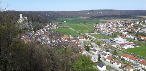 Endlich mal wieder ein Fotomotiv: Die Burgruine von Hütting, stolz stehend auf einem Felsen. Schön der Ausblick hinunter. Die bunten Häuschen im Urdonautal wie aus dem Bilderbuch. Ich laufe weiter, wieder verschluckt mich der Wald.