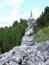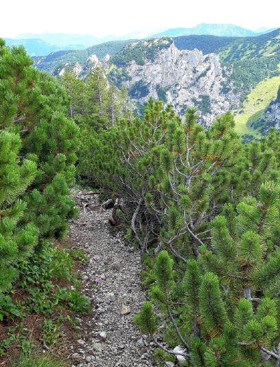 Vorbei am Rotwandhaus - erstaunlich wenig los - nehme ich das kurze Stück zum Gipfel in Angriff. Die Fernsicht leider nicht so toll. Egal, der Hochmiesing ist gut zu sehen. Die Vorfreude wächst. Geschwind geht es die Autobahn vom Gipfel hinunter zum Rotwandhaus und zurück zur Kümpflscharte. Dort beginnt eine landschaftlich reizvolle Querung unterhalb der günen Rotwand hinüber zum Miesingsattel. Hinter mir die Ruchenköpfe, vor mir der Hochmiesing und rechts der weite Blick hinunter in Richtung Soinsee. Traumhaft schön. Auch die Rotwand von Westen aus gesehen. Auf den Pfad allerdings muss ich achten, denn der ist anfangs verblockt und schlammig. Hochmiesing 40 Minuten lese ich bald. Oben am Sattel ist die Zeit auf 30 Minuten geschmolze. Jetzt braucht's nur noch einen g'scheiten Trail hinauf, denke ich mir, und der Wunsch wird erfüllt. Mit den Stöcken, die es nicht gebraucht hätte, geht es durch Latschengassen und freies Gelände hinauf. Ein Steinmännchen, fast schon ein Schlumpf, blickt stoisch geradeaus.