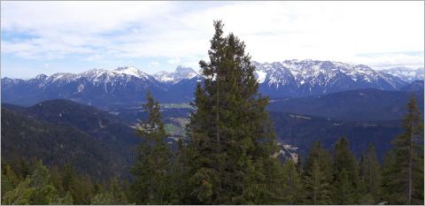 Froh, dieses Stück hinter mir zu haben, verschluckt mich der Wald, und ich bin wieder auf einem Wanderweg unterwegs. Ich kenne diesen Abschnitt, wenngleich ich hier mit Christian bei Minusgraden von unter 10 Grad Ende Januar 2017 vom G-Bauern herkommend unterwegs war. Der Blick hinüber zum Wetterstein und Karwendel damals wie heute phantastisch. Der Weg wandelt sich immer mehr zu einem Gebirgspfad. Bevor es allerdings hinauf zum Wank geht, muss, nein darf ich, 100hm hinunterwieseln. Gleich zu Beginn stoße ich auf vier Mütter mit einem Babyjogger, die kurz vor Ende ihres Anstiegs hängengeblieben sind und arg schnaufen (und jammern). Ob es noch weit hinauf gehe? Ich kann sie beruhigen und laufe weiter. Die wenigen Höhenmeter hinunter sind flugs vorbei, und ich freue mich auf die 1000hm Downhill am Ende der Runde. Erstmal aber geht es oberhalb vom G-Bauern 700hm hinauf - und ich werde überrascht.